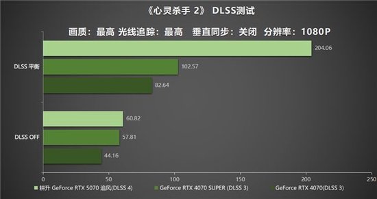 通过对《心灵杀手2》进行测试,可以观察到,在1080P的分辨率下,耕升 GeForce RTX 5070 追风在启用DLSS技术时,能达到平均204.06帧的超高帧数。相较于GeForce RTX 4070 SUPER和GeForce RTX 4070的102.57帧和82.64帧,其性能提升涨幅约为94%,展现出比前一代的两款显卡更为卓越的性能表现。