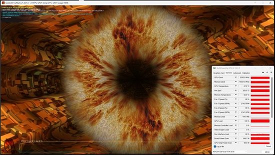 接下来使用负载软件FurMark来测试耕升 GeForce RTX 5070 追风的功耗控制能力。在开启负载软件压榨GPU后,待温度与功耗达到稳定,测试得出最终GPU功耗为249.7W,温度67.9℃,有着非常优异的性能表现。