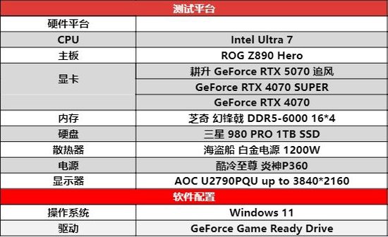 本次测试将采用以下配置:CPU选用了Intel Ultra 7,搭配ROG Z890 HERO主板,内存方面搭载了4条芝奇 幻锋戟 DDR5-6000Hz 16GB内存条,电源方面则采用了海盗船 白金1200W电源,散热部分则使用了酷冷至尊 炎神P360一体式水冷。这套经过精心设计的配置,不仅为GPU提供了高效的处理能力,还进一步稳定了显卡的温度,这套配置使得耕升 GeForce RTX 5070 追风拥有十分高效性能,无论是应对复杂的图形处理任务,还是运行高负载的游戏,都能轻松胜任。