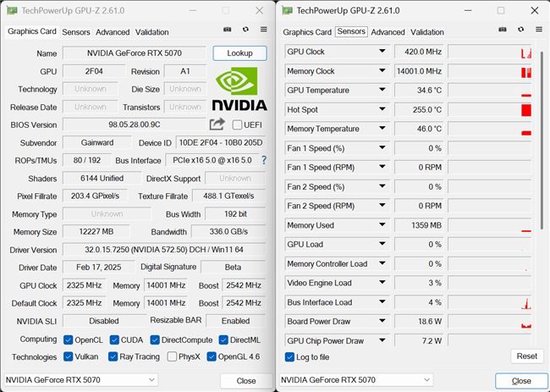 由检测软件GPU-Z可看到耕升 GeForce RTX 5070 踏雪 OC具体的参数表现和实际规格。通过数据可以看到,在待机状态下,显卡温度为34.6℃,功耗为18.6W。