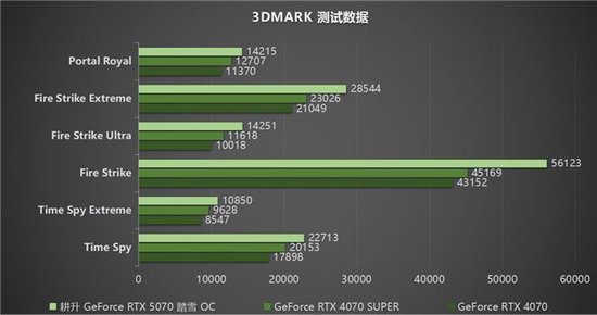 首先使用3D Mark软件对GPU进行基准测试,从测试结果上来看,耕升 GeForce RTX 5070 踏雪 OC在多个数据指标上与GeForce RTX 4070 SUPER和GeForce RTX 4070相比均有明显的性能提升。在Fire Strike测试中,耕升 GeForce RTX 5070 踏雪 OC的分数高达56123分,而在Port Royal测试中,其14215分的得分与前代显卡的12707分和11370分形成显著对比,实现25%的增幅。而耕升 GeForce RTX 5070 踏雪 OC在Time Spy Extreme中也拥有10850分,彰显出其优秀的表现。总体来看,耕升 GeForce RTX 5070 踏雪 OC不仅在性能上拥有增幅,而且其强大的基础配置也充分满足内容创作者和游戏玩家的需求。