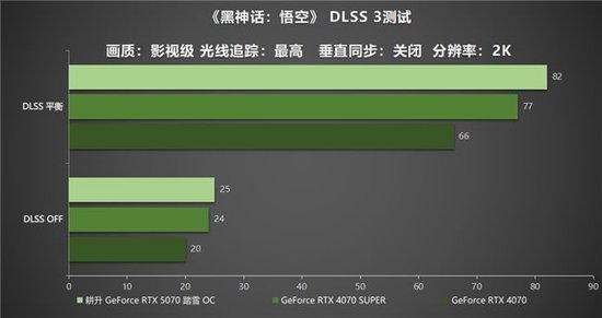 在2K分辨率,影视级画质下,开启光线追踪和DLSS 3技术时,GeForce RTX 4070的平均帧数为66帧,而耕升 GeForce RTX 5070 踏雪 OC平均帧数可以跑到82帧,拥有稳定流畅的性能表现。