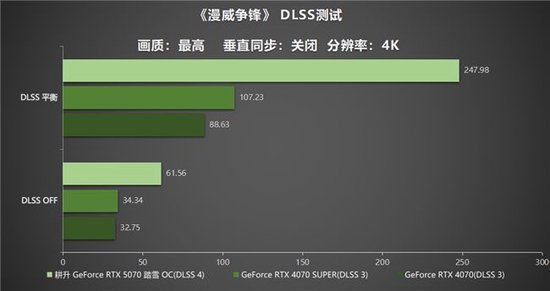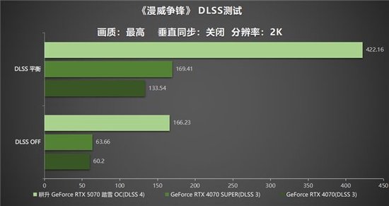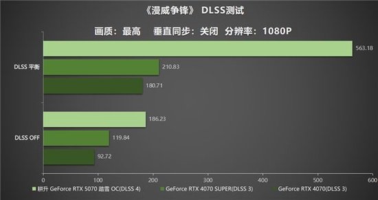 在1080P分辨率下,耕升 GeForce RTX 5070 踏雪 OC凭借自身性能可以轻松面对《漫威争锋》,帧数为186.23帧。而在开启DLSS 4 平衡模式后,其拥有202%的超大涨幅,直接高达563.18帧。借助NVIDIA DLSS 3技术,GeForce RTX 4070 SUPER平均帧数为210.83帧,GeForce RTX 4070平均达到180.71帧,也能够实现流畅的游玩。