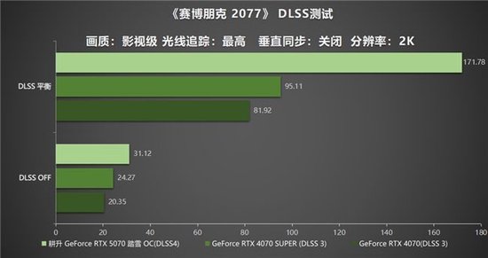 将分辨率提升到2K后,耕升 GeForce RTX 5070 踏雪 OC无论是关闭DLSS还是开启DLSS 3平衡模式,都展现出了显著的性能优势,尤其是在DLSS 4技术的加持下,帧率提升较为明显,平均帧数为171.78帧,为玩家提供了更加流畅的游戏体验。而GeForce RTX 4070 SUPER和GeForce RTX 4070虽然表现不俗,但在面对更高性能的耕升 GeForce RTX 5070 踏雪 OC时,仍有一定的差距。对于追求极致画质和流畅度的玩家来说,耕升 GeForce RTX 5070 踏雪 OC无疑是一个优秀的选择。