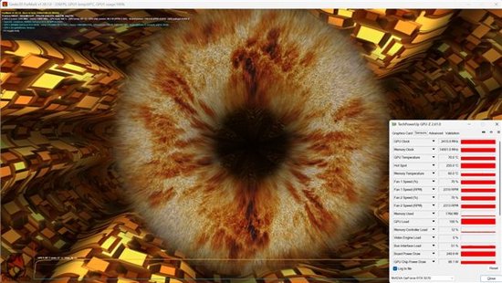 通过FurMark软件的测试,在室温26度的情况下,显卡在满负荷运行状态时的温度为70℃,功耗为249.9W,耕升 GeForce RTX 5070 踏雪 OC的温控表现十分出色。在GPU全负荷运行的情况下,得益于其高效的散热器和先进的散热架构设计,耕升 GeForce RTX 5070 踏雪 OC成功将温度控制在稳定水平,展现了其出色的散热性能与稳定性。这一表现不仅证明了其在高压环境下的可靠性,也进一步凸显了作为高性能显卡卓越的实力。