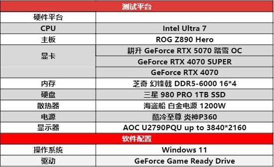 本次测试将采用以下配置:CPU选用Intel Ultra 7,搭配ROG Z890 HERO主板,内存方面搭载了4条芝奇 幻锋戟 DDR5-6000Hz 16GB内存条,电源方面则采用了海盗船 白金1200W电源,散热部分则使用了酷冷至尊 炎神P360一体式水冷。这套配置为耕升 GeForce RTX 5070 踏雪 OC提供了一个稳定的性能输出环境,使其能够充分发挥出强大的性能潜力,满足玩家与创作者对性能的需求。