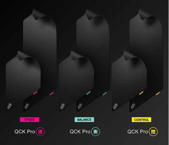 QCK Pro(QCK PERFORMANCE SERIES)系列包含三款定制化鼠标垫——QCK Pro速(QCK PERFORMANCE SPEED)、QCK Pro衡(QCK PERFORMANCE BALANCE)、QCK Pro控(QCK PERFORMANCE CONTROL),提供L和XL两种尺寸,精准满足不同玩家的操作需求。