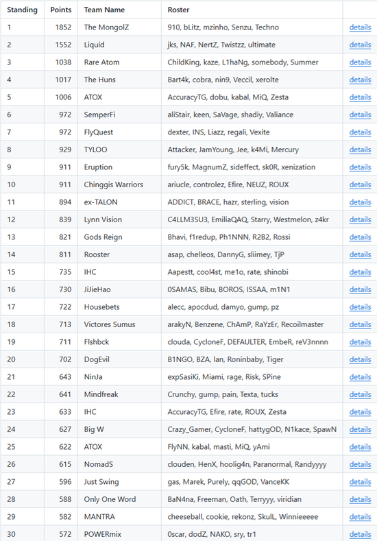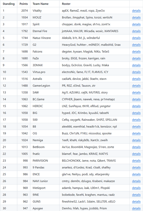 欧洲区方面和世界排名保持高度一致,世界第一战队Vitality的积分超过第二名MOUZ 140分,而之前Spirit仅比Vitality多24分。