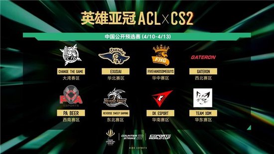 自2月15日至3月28日,经过英雄亚冠ACL x CS2全国海选赛在国内32个城市的激烈角逐,8支实力强劲的队伍从一千多支队伍中突破重围,成功晋级英雄亚冠ACL x CS2的中国公开预选赛,即将在盐城开启新的征战篇章。他们是Change The Game、Exusiai、FiveHandsomeGuys、Gateron、PA BEER、Reverse sweep gaming、DK ESPORT和 TEAM XDM。
