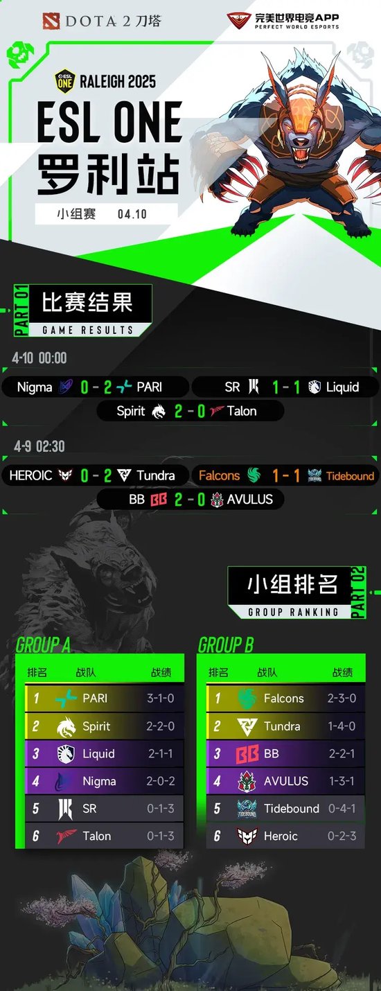 ESL One罗利站小组赛的比赛结束,PARI、Spirit、Falcons和Tundra晋级淘汰赛胜者组,Liquid、Nigma、BB和AVULUS进入淘汰赛败者组,SR、Talon、Tidebound和HEROIC从本次赛事中淘汰。