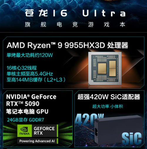 苍龙16ultra作为顶配旗舰款电竞游戏本,搭载了AMD锐龙9 9955HX3D处理器,单靠最大功率消耗约120W,16核心32线程,单核主频最高5.4GHz,最高144MB缓存。NVIDIA GeForce RTX5090显卡,24GB显存。此外,还使用了超强420W Sic适配器,超大功率,小体积。豪华的硬件是游戏玩家在复杂的游戏场景下和长时间高强度竞技时取胜的第底气。