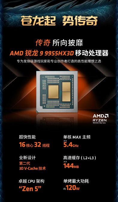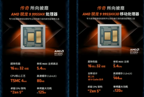 该系列的性能核心——锐龙9 9955HX和9955HX3D处理器,基于先进的Zen 5架构,拥有16核心32线程和5.4GHz的高加速频率。