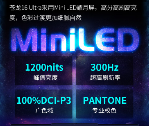 此外,苍龙16系列还有着30Hz超高刷新率,2560x1600高分辨率,50nits高分辨率,100%RGB高色域。