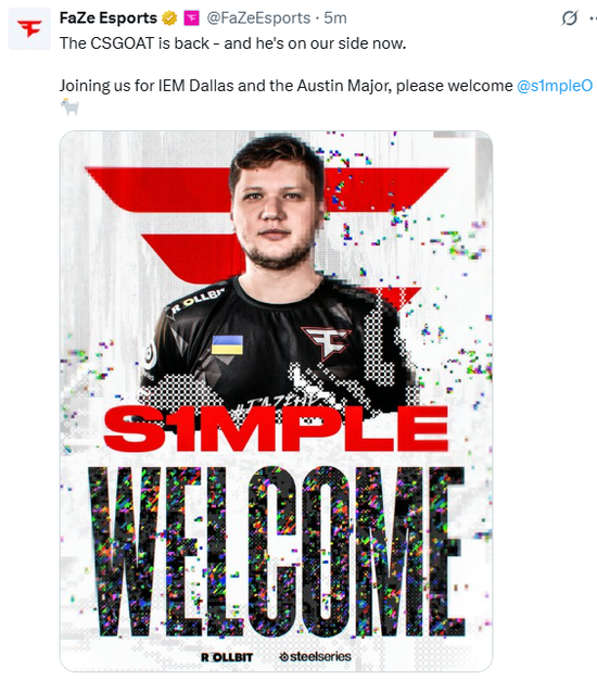 就在刚刚,FaZe于官推宣布临时租借乌克兰传奇选手s1mple,以备战奥斯汀Major。