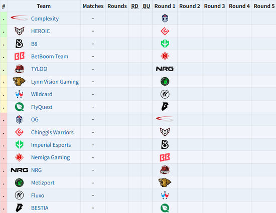 中国战队TYLOO首战对阵NRG,而另一支中国队伍Lynn Vision会面对Metizport战队。从第二轮到第五轮的比赛都将采用布赫霍尔兹(Buchholz) 系统以及各队伍的初始种子排名来确定比赛对阵顺序。