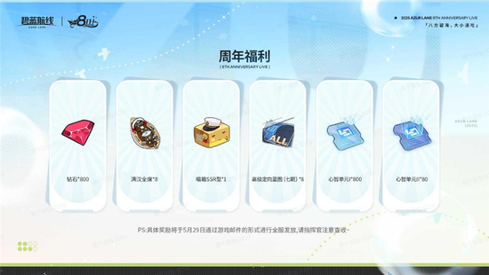 为感谢指挥官多年来的支持,《碧蓝航线》8周年活动多多,感恩福利人人可得。周年奖励有直播奖励、心动福利和周年庆奖励,三者皆通过游戏邮件进行全服发放。其中8周年直播奖励会在5月20日8周年第一弹活动上线时进行发放,内含物资*15000、心智魔方*20和快速完成工具等道具;心动福利则于8周年页面心动福利活动达成后发放;而8周年庆礼包会在5月29日进行发放,届时海量钻石、SSR喵箱和心智单元等道具登录即领!