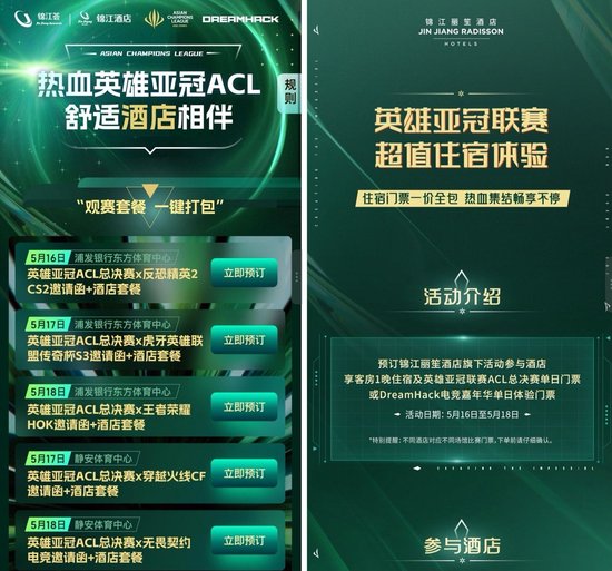5月16日-18日,首届英雄亚冠ACL总决赛将陆续在国家会展中心(上海)及浦发银行东方体育中心、静安体育中心三大场馆,开启王者荣耀、虎牙英雄联盟传奇杯、云顶之弈、无畏契约、穿越火线等的总冠军争夺战。锦江国际将持续助力共同把赛事氛围推向高潮,释放“文旅+电竞”跨界融合的消费潜力。