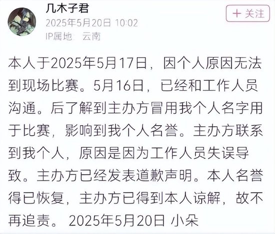 事后真正的当事人几木子君也表示,生气的原因在于“有人用我的名字顶替我参加比赛,影响个人名誉”。
