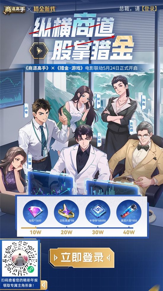 此外,益世界《商道高手》官网发起的《猎金·游戏》电影联动活动现已开启,前往官网登录即可领取金喜好礼,邀请好友加入还能解锁豪华礼包,坚持每日签到还有多重游戏道具正待抽取。扫描图中二维码,一起开启猎金之旅吧!