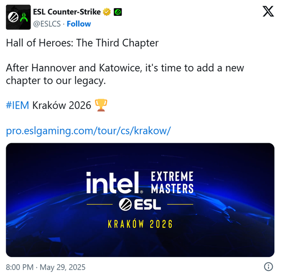 ESL宣布了一项新赛事——IEM 克拉科夫站,它将在赛程表上取代IEM 卡托维兹站。该赛事将于2026年1月27日至2月8日举行,赛事最后三天淘汰赛阶段的比赛,将在陶龙竞技场面向观众进行。