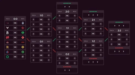 当一支队伍获得两胜或两负时,比赛变得更加关键,因为这些比赛将决定晋级或淘汰。这些重要比赛将采用三局两胜制(BO3),而此前的比赛都是单局决胜(BO1)