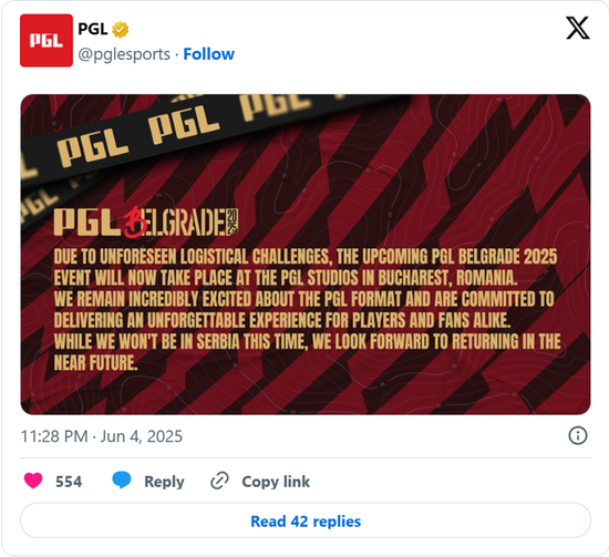 PGL已宣布,2025 PGL 贝尔格莱德站赛事现将在罗马尼亚布加勒斯特的PGL演播室举办。赛事主办方称,此次变动的原因是 “不可预见的后勤挑战”。