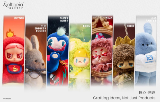 品牌旗下拥有Adou阿豆、Cino、Super Alber超级艾伯、HUG PARTY Ⅱ、Echo、无尽之森、Kiyomi等IP系列,首创推出“精品毛绒盲盒”、“PPF精品毛绒手办”等创新品类,以“更显品质感、更有创新力、更具情绪和社交价值”的精品毛绒潮玩为消费者带来富有想象力的美好体验。