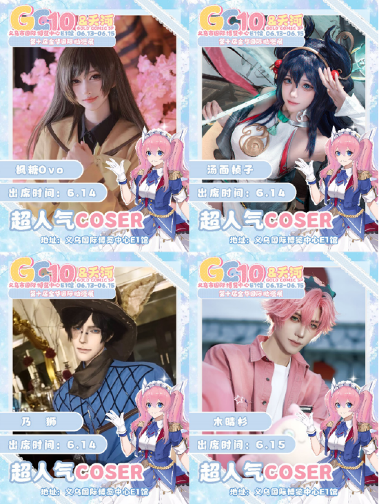 今年ZET除了上述的参展企业外,我们还引入了第十届金华国际动漫展GC10。本次的GC10除了会有精彩纷呈的活动之外,更是邀请到了汤面帧子,枫糖Ovo,乃狮和木晴杉四位超人气Coser来到展会现场与粉丝朋友进行精彩互动。为我们带来了属于动漫二次元的浪漫与美好。