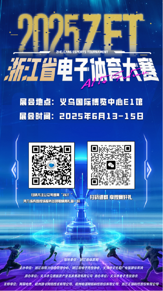 2025ZET浙江省电子体育大赛(Zhejiang Esports Tournament)正式定档6月13日-15日在义乌国际博览中心E1馆启幕,本次大赛由浙江省智力运动管理中心、浙江省电子竞技协会和义乌市文化和广电旅游体育局共同主办,义乌市交通旅游产业发展集团有限公司承办,义乌市电子竞技协会协办。本届赛事以“AI向未来”为核心主题,努力打造“科技+竞技+动漫”三位一体的赛事概念。