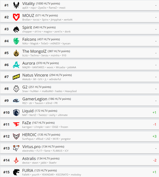 今天HLTV公布了最新一期世界排名,相比于之前的排名,本次排名中前十的变动幅度很小。但随着在BLAST.tv 奥斯汀Major第一阶段的结束和第二阶段的进行,该排名的后半部分变动不小。