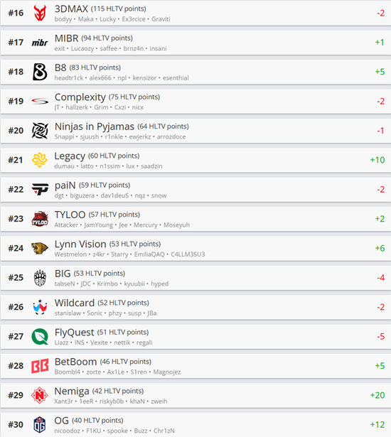 21-30名中,中国战队TYLOO上升两位,当前位列23名。而Lynn Vision战队则进步6位,当前24名。Top30里进步最大的当属Nemiga战队,进步20位,目前29名。