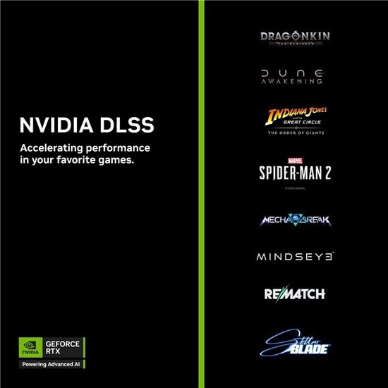 ● 《漫威蜘蛛侠2》(Marvel's Spider-Man 2):蜘蛛侠彼得·帕克和迈尔斯·莫拉莱斯在《漫威蜘蛛侠2》(Marvel's Spider-Man 2)中回归,开启广受好评的漫威蜘蛛侠系列的一段新冒险。游戏PC版首发即支持DLSS帧生成、DLSS超分辨率、DLSS光线重建、DLAA、NVIDIA Reflex和多种光线追踪效果。游戏为RTX 50系列玩家更新支持DLSS 4多帧生成,使帧率倍增。开启DLSS 4多帧生成和DLSS光线重建,《漫威蜘蛛侠2》(Marvel's Spider-Man 2)在RTX 50系列GPU上的性能表现在4K分辨率、最高光线追踪和其他画质选项下,最高可平均提升至4.9倍。