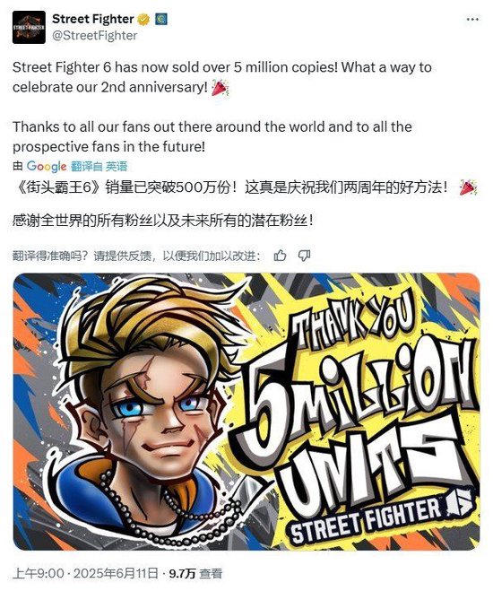 卡普空今日正式宣布,在迎来发售两周年之际,《街头霸王6》全球累计销量已突破500万份大关。