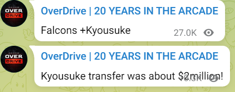 今日早些时候,独联体爆料人OverDrive在社交平台上发布动态,进一步确认Falcons即将签下kyousuke的消息。同时他还透露,kyousuke的转会费大概为200万美元,对比当初m0NESY的60万美元转会费,可以说这是个天文数字。