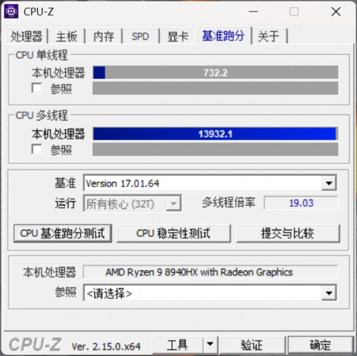 性能实测中,CPU-Z单线程得分732.2分,多线程得分高达13923.1分,多线程倍率达到19.03倍。