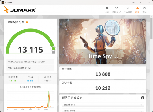 在3DMark Time Spy测试中,整机总分达到13115分,其中显卡分数13808分,处理器分数10212分,充分证明了RTX 5070应有的强劲图形性能。