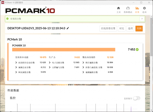在代表整机综合性能的PCMark 10测试中,蛟龙16Z Pro总成绩为7652分,其中常用基本功能10075分,生产力9632分,数位内容创作12530分,成绩优异,体现了其强大的综合实力。