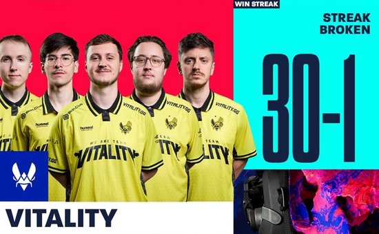 在被淘汰前,Vitality的连胜记录直逼传奇战队在2012-2013年创下的60场线下赛事的不败记录。