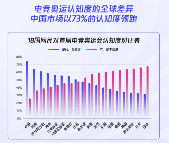 2027年,首届电竞奥运会即将在沙特阿拉伯举办,《报告》显示中国受访者对电竞奥运会的认知度达到73%,居于全球前列,越南、沙特阿拉伯位居二三位。菲律宾、印度尼西亚等新兴市场对电竞奥运会和虚拟体育项目的态度积极程度更高。