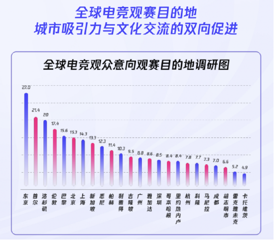 《报告》指出,举办2024年电子竞技世界杯的利雅得在24个观赛目的地城市中位列第11位,超越科隆、哥本哈根等电竞名城。这表明电竞有效促进了城市吸引力提升与文化双向交流,加深了观众对海外城市的认知,并有力助推海内外观众转化为城市游客。