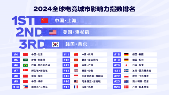 《报告》显示,上海、洛杉矶、首尔凭借长期投入与业态聚集优势,在“全球电竞城市影响力榜单”中排名前三。北京、深圳、成都也入选榜单前十。