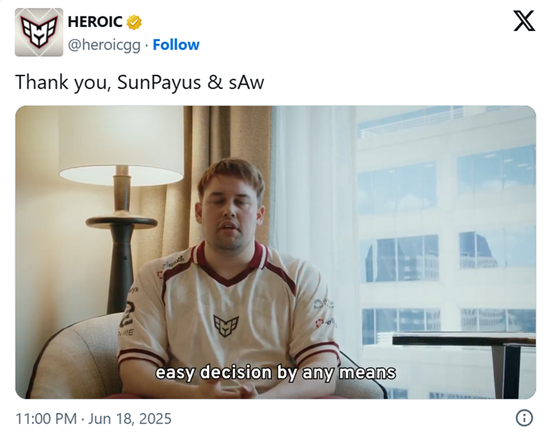 HEROIC已确认sAw及SunPayus的离队消息,两人即将转会加盟G2。