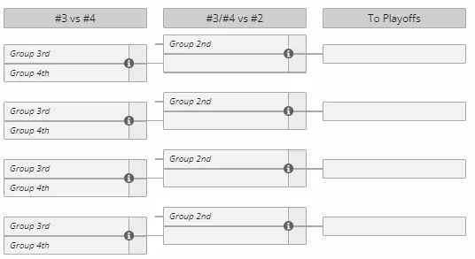 第二阶段为突围赛,12支队伍将根据第一阶段小组赛名次划分为四组,并进行Bo3冒泡突围赛。第一阶段的第二名会直接进入各组突围赛的第二轮,三四名进入突围赛第一轮。突围赛每组将决出一支队伍进入第三阶段。