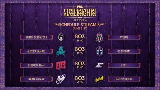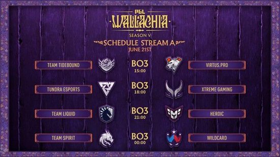 PGL瓦拉几亚S5将于6月21日在PGL总部所在地,罗马尼亚布加勒斯特举办,中国战队AG(Tidebound现已改名All Gamers Global)和XG将参加本次比赛。与往届相同,PGL瓦拉几亚S5总计16支战队参赛,总奖金为100万美元。比赛第一阶段为瑞士轮,16支战队中将有8支战队晋级,8支战队淘汰。第二阶段为双败淘汰赛,总决赛为Bo5,其余比赛均为Bo3。瑞士轮首轮对阵已公布,AG(Tidebound)将在15:00对阵VP,XG将在18:00对阵Tundra。