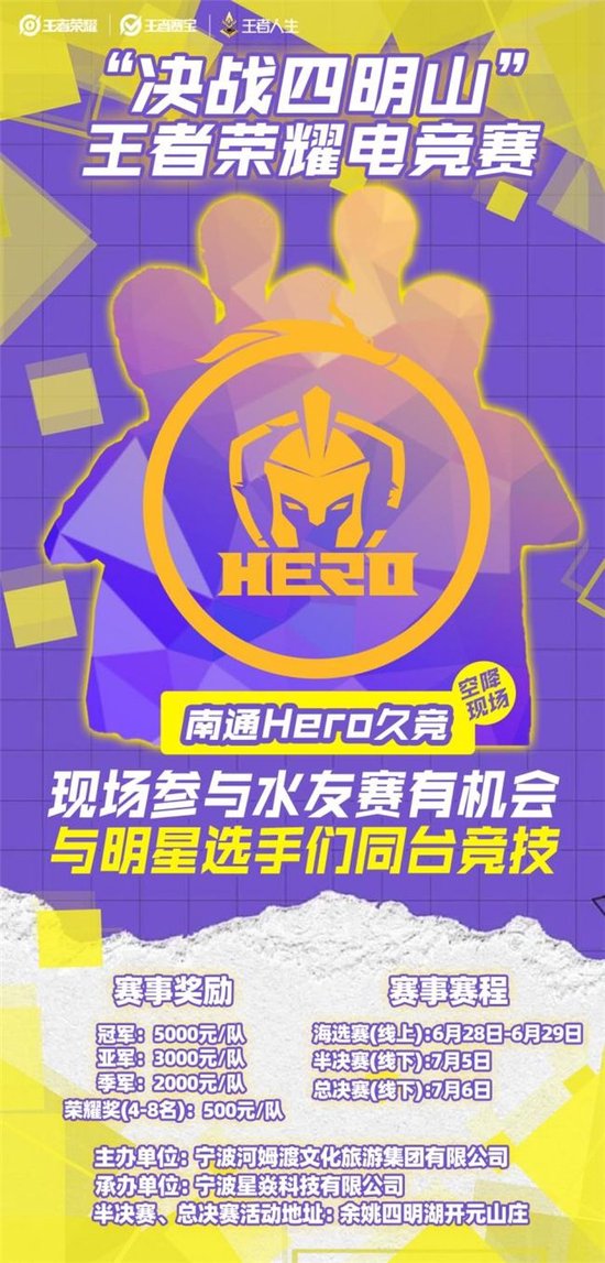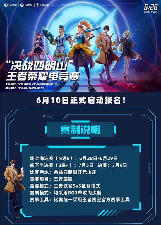 本次 “决战四明山” 王者荣耀电竞赛报名现已开启。参赛对象为18至60周岁的电竞爱好者,每支参赛队伍限报1队,参赛选手5名(可含替补1名),赛程期间不得更换运动员。比赛为当前赛季版本,选手需自备王者账号参赛。