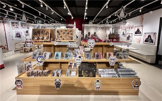 此外,店内还将本次主题店全部的限定周边进行了集中陈列展示,打造沉浸式消费场景,顾客“不是在挑选周边,而是在选定自己的刺客信条”。