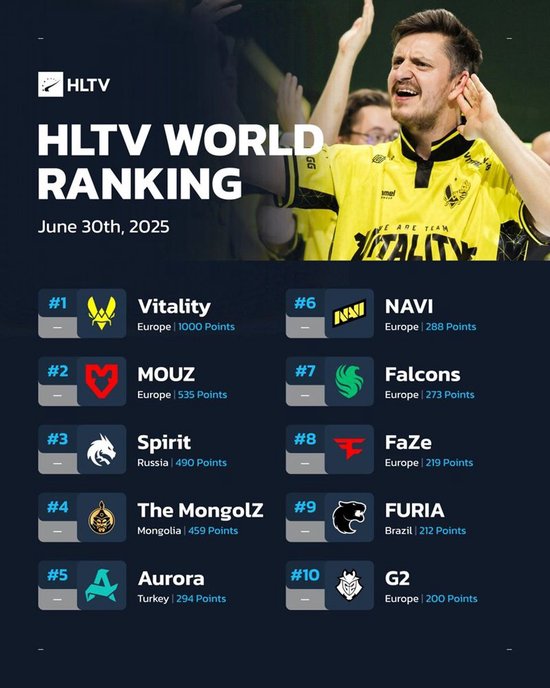 今天HLTV公布了最新一期世界排名,相比于之前的排名,本次排名中前十的变动幅度很小。进入夏季休赛期之后,选手们纷纷“刀枪入库、马放南山”,因此队伍积分排名也没有什么变化。