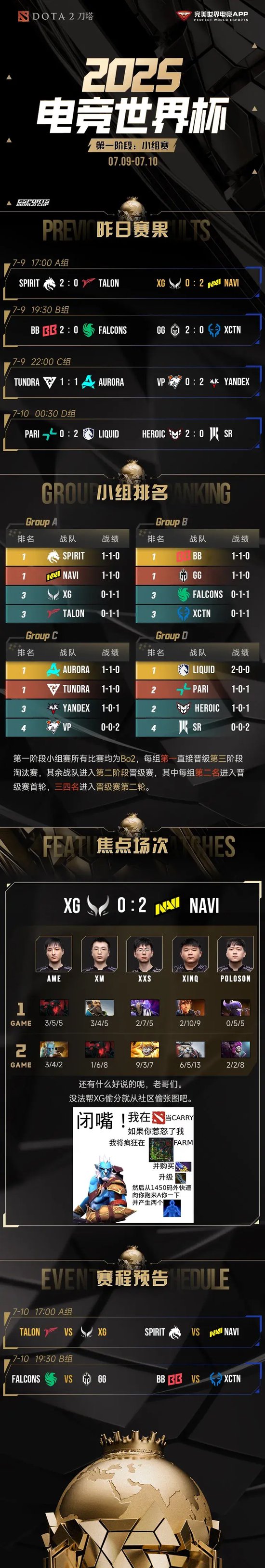 电竞世界杯2025小组赛第二日比赛结束,XG在小组赛第二场对阵NAVI的比赛中,一局被滚雪球碾压,一局被翻盘。目前XG两战仅积一分,和Talon并列A组第三。