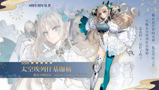 《FGO》9周年活动的重头戏,自然是9周年限定从者“太空埃列什基加勒”正式登场!在美索不达米亚神话中,埃列什基加勒是冥界的统治者。而在《FGO》的叙事中,在第七特异点、冥界圣诞、水怪危机乃至第七异闻带,艾蕾都有着让人非常印象深刻的表现,因此其在《FGO》玩家中的人气还是相当高的。值此9周年活动之际,兽艾蕾“太空埃列什基加勒”作为周年从者闪亮登场,可以说是众望所归。