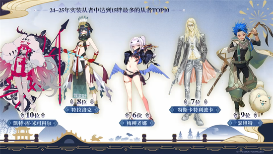 另外一项非常有趣的玩家数据是2024年至2025年实装从者中达到15绊最多的从者TOP10,前TOP5中不但有去年的8周年从者“救世主梣”,还有“阿尔托莉雅·卡斯特”、“库库尔坎”等从者,冠军则是“所多玛之兽/德拉科”,这些名列前茅的从者中有没有御主你的最爱呢?
